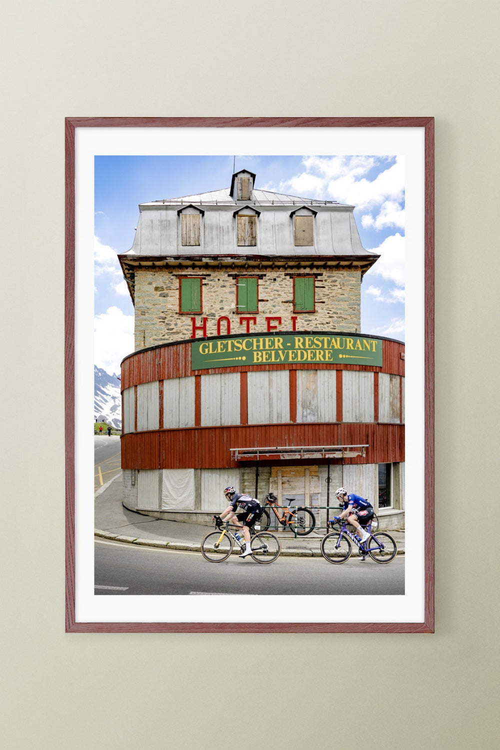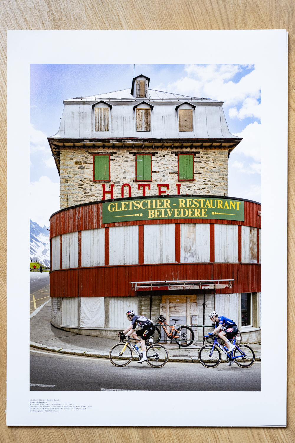 “Hotel Belvedere” is a museum-grade photo print from the Classic Velo Collection — a series of my personal favourite pics celebrating the atmosphere, action and iconic landscapes of cycling. Rather than focusing on a single rider, these prints capture the spirit of the sport itself.