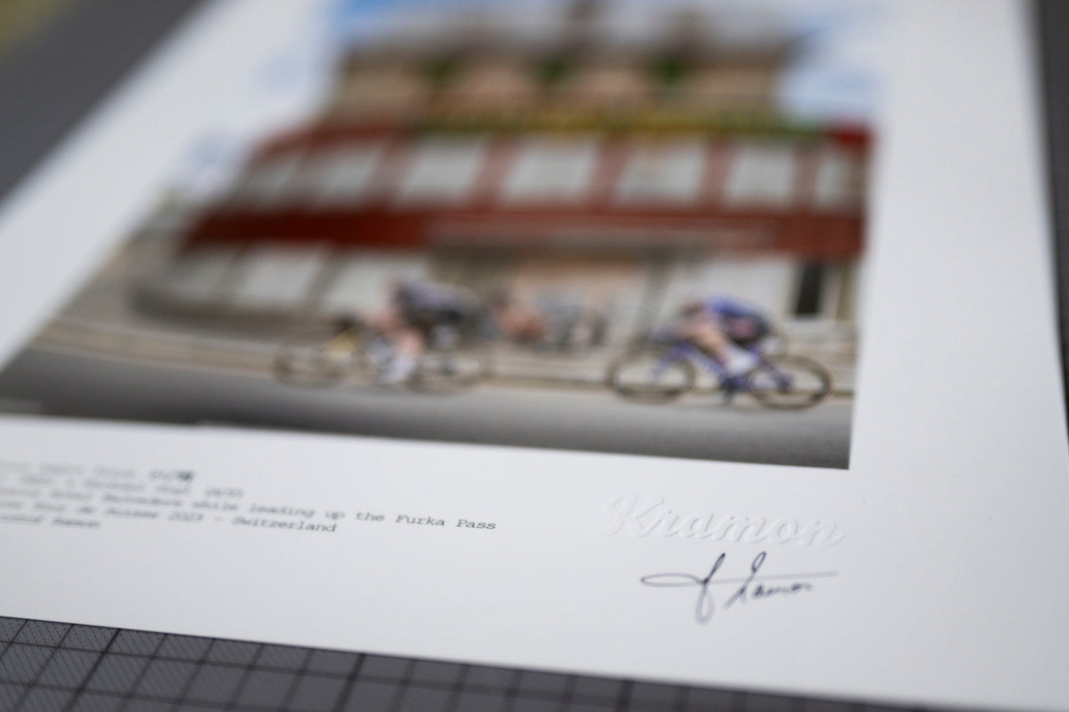 If a print needs to be produced on demand —especially when Kramon is on the road during race season— we will print, sign, and ship once approved by the photographer. You’ll receive an update from the studio when this applies.