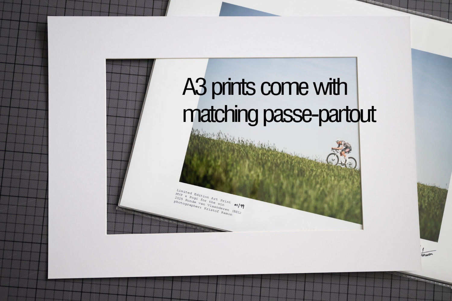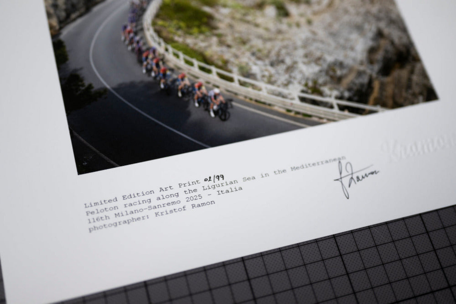 If a print needs to be produced on demand —especially when Kramon is on the road during race season— we will print, sign, and ship once approved by the photographer. You’ll receive an update from the studio when this applies.