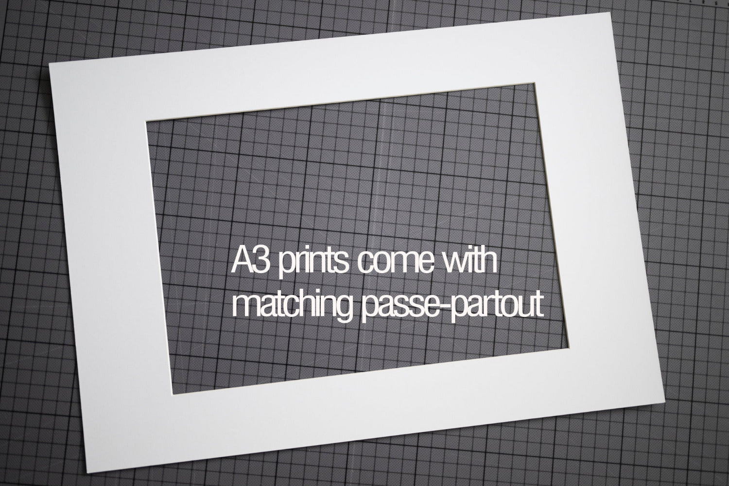 All prints are signed, numbered, and embossed, shipped flat (so no curling), and the A3 size includes a matching passe-partout.